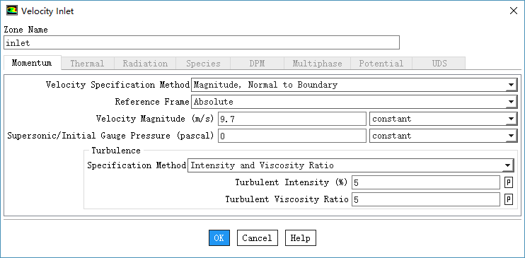 鼠标双击模型树节点Boundary Conditions > inlet,设置速度为9.7 m/s