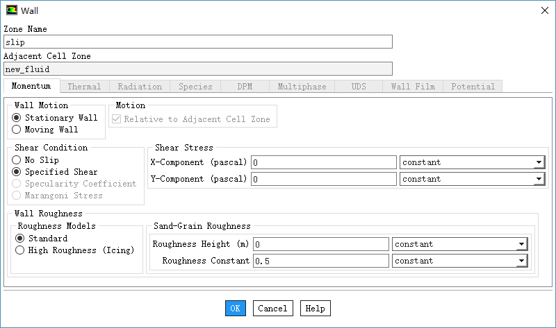 鼠标双击模型树节点Boundary Conditions > slip,设置shear conditions为Specified Shear,如下图所示