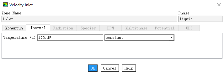 鼠标双击模型树节点Boundary Conditions > inlet > liquid,切换至Thermal标签页,如下图所示设置液相温度为472.45 K