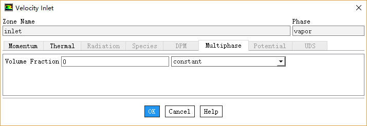 鼠标双击模型树节点Boundary Conditions > inlet > vapor,切换至Multiphase标签页,如下图所示设置气相体积分数为0