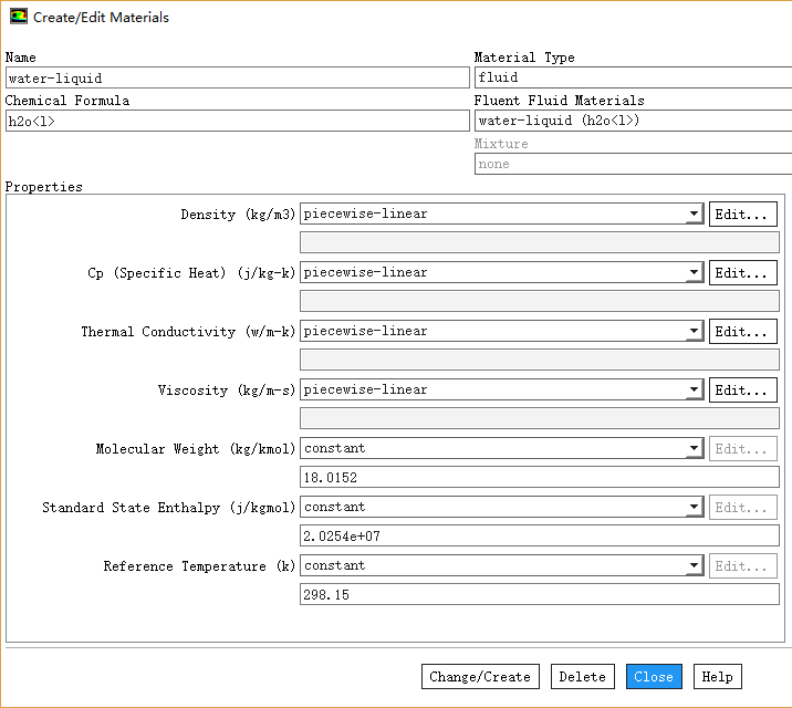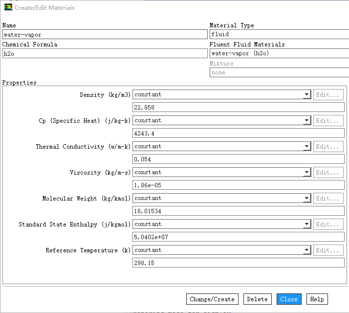 从材料库中添加材料water及water-vapor,并修改其材料参数