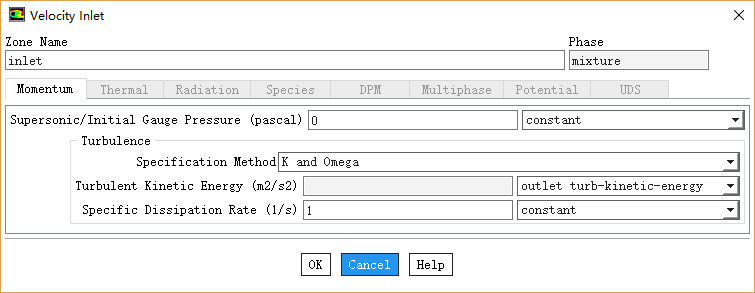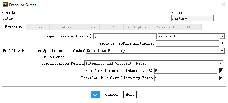 鼠标双击模型树节点Boundary Conditions > outlet,弹出对话框中如下图所示设置参数