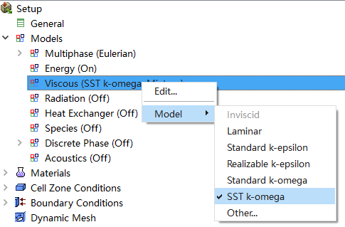 右键选择模型树节点Models > Viscous,点击弹出菜单项Model → SST k-omega激活SST k-w湍流模型