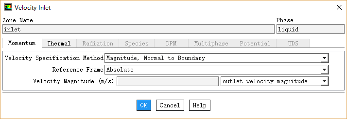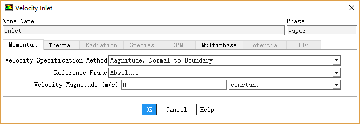 鼠标双击模型树节点Boundary Conditions > inlet > vapor,弹出对话框中如下图所示设置入口气相速度为0