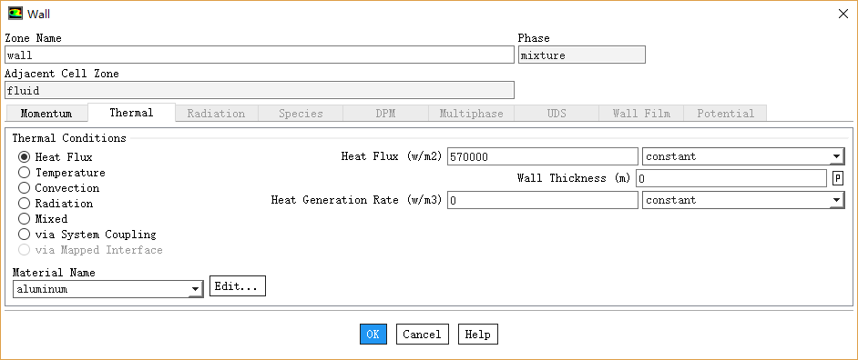 鼠标双击模型树节点Boundary Conditions > wall,如下图所示,设置壁面热流为57000 w/m2