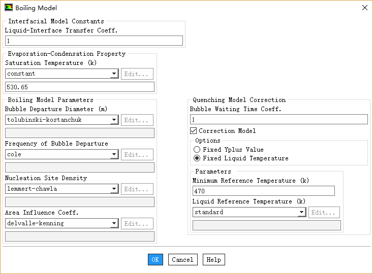 点击Eidt…按钮进入沸腾模型设置对话框,如下图所示进行参数设置