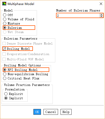 鼠标双击模型树节点Models > Multiphase,弹出对话框中如下图所示,选择Eulerian,并选择Boiling Model及RPI Boiling Model