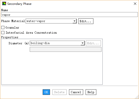 鼠标双击模型树节点Models > Multiphase > Phase > Secondary Phase,弹出对话框中设置water-VAPOR为主相,并修改名称为vapor,设置Diameter为boiling-dia