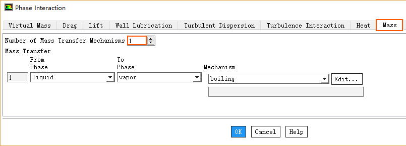 鼠标双击模型树节点Models > Multiphase >Phase Interactions,弹出对话框中进入Mass标签页,如下图所示进行设置