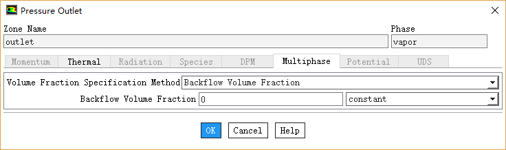 鼠标双击模型树节点Boundary Conditions > outlet> vapor,切换至Multiphase标签页,如下图所示设置气相体积分数为0
