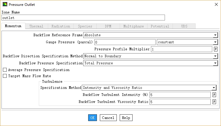 双击模型树节点Boundary Conditions > outlet,弹出对话框中设置如下图所示湍流条件