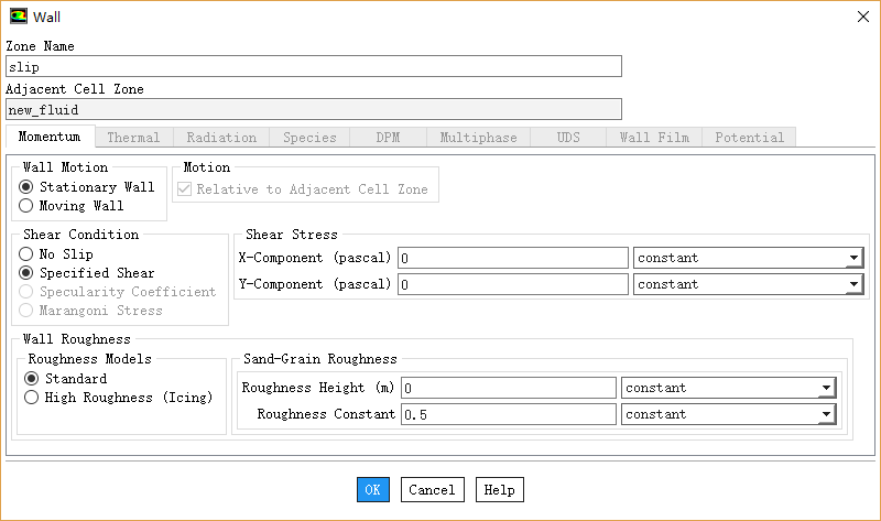 双击模型树节点Boundary Conditions > slip,弹出对话框中激活选项Specified Shear,其他参数保持默认设置