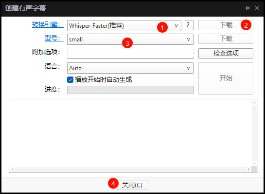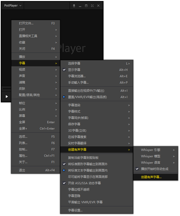 PotPlayer是一款比较流行的视频播放器,在其最新版本(PotPlayer 241212)中提供了使用Whisper从语音生成字幕的功能(见官网介绍http://www.potplayercn.com/),结合该软件之前版本提供的字幕翻译功能,就能实现在播放任意视频时自动生成字幕并将字幕翻译成想要的目标语言。