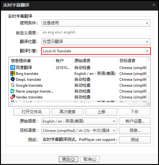 在打开的 实时字幕翻译 对话框中选择 翻译引擎 为 Local AI Translate ,点击按钮 测试
