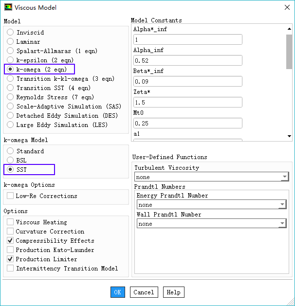 鼠标双击模型树节点Models > Viscous,弹出的对话框中选择激活选项k-omega及SST以启用SST k-w湍流模型