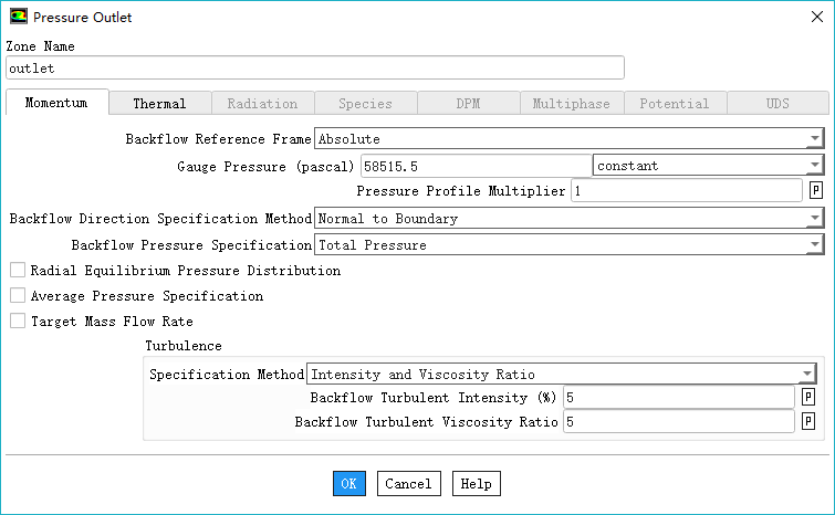 进入Momentum标签页,如下图所示设置Gauge Pressure为58515.5 Pa,湍流条件按图中所示参数设置