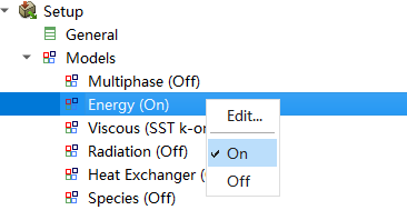 右键选择模型树节点Models > Energy,点击弹出菜单项On,激活能量方程