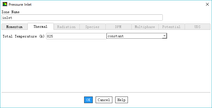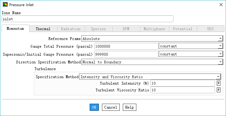 进入Momentum标签页,如下图所示设置Gauge Total Pressure为1e6 Pa,设置Supersonic/Initial Gauge Pressure为999900 Pa