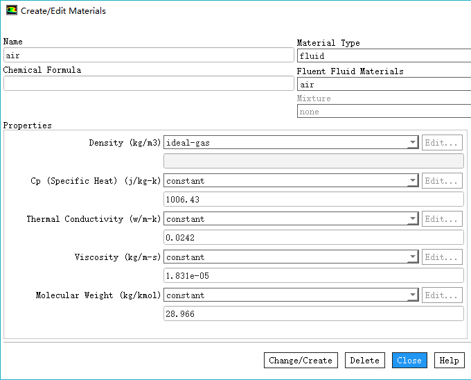 鼠标双击模型树节点Materials > Fluid > air,弹出材料属性设置对话框