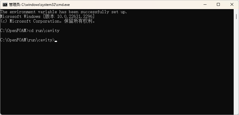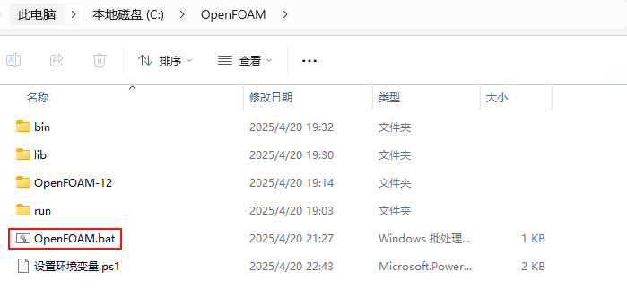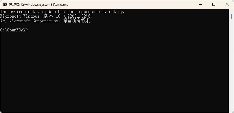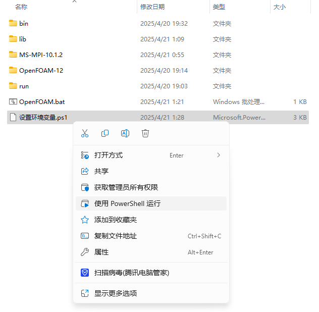 右键选择文件 设置环境变量.ps1,然后点击弹出菜单项使用PowerShell运行,稍作等待即可自动添加环境变量。添加完毕后即可在任意cmd或powershell窗口中运行OpenFOAM求解器及各种工具了。