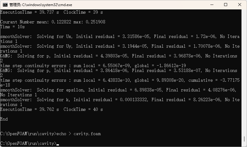 echo > cavity.foam可以在当前路径下创建一个名为cavity.foam的空文件,然后可以使用Paraview读取此文件进行后处理。