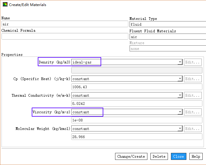 鼠标双击模型树节点Materials > Fluid > air弹出材料属性设置对话框