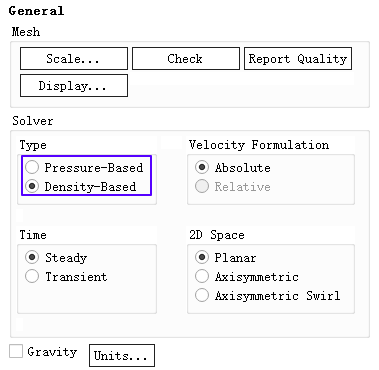 鼠标双击模型树节点General,右侧面板选择Density-Based采用密度基求解器