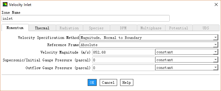 Momentum标签页设置Velocity Magnitude为852.68 m/s