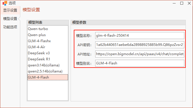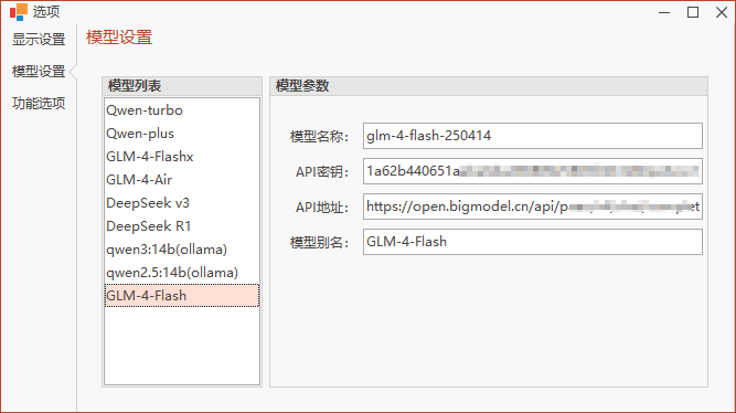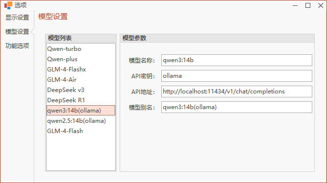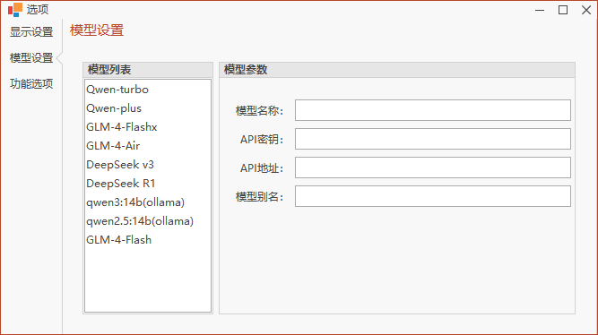 直接填写模型名称、模型秘钥、API地址、模型别名后即可自动保存模型信息。然后就可以在主窗体的模型选择列表中进行选择了。