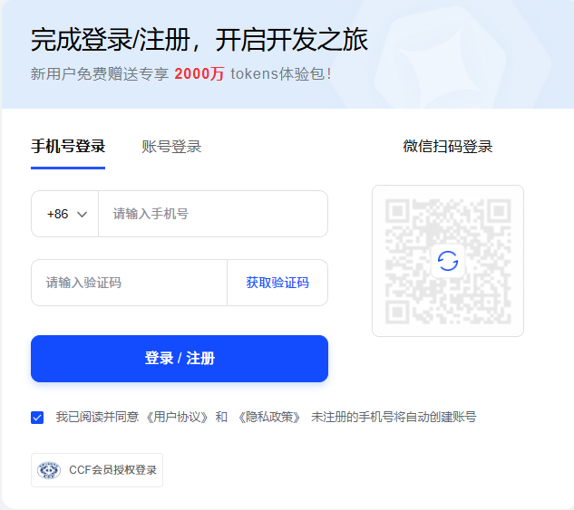 点击 登录/注册 按钮可以登录或注册。第一次注册好像是送2000万token,其实是折算成18块钱,就目前他们家的大模型价格来说,可以用很久了。