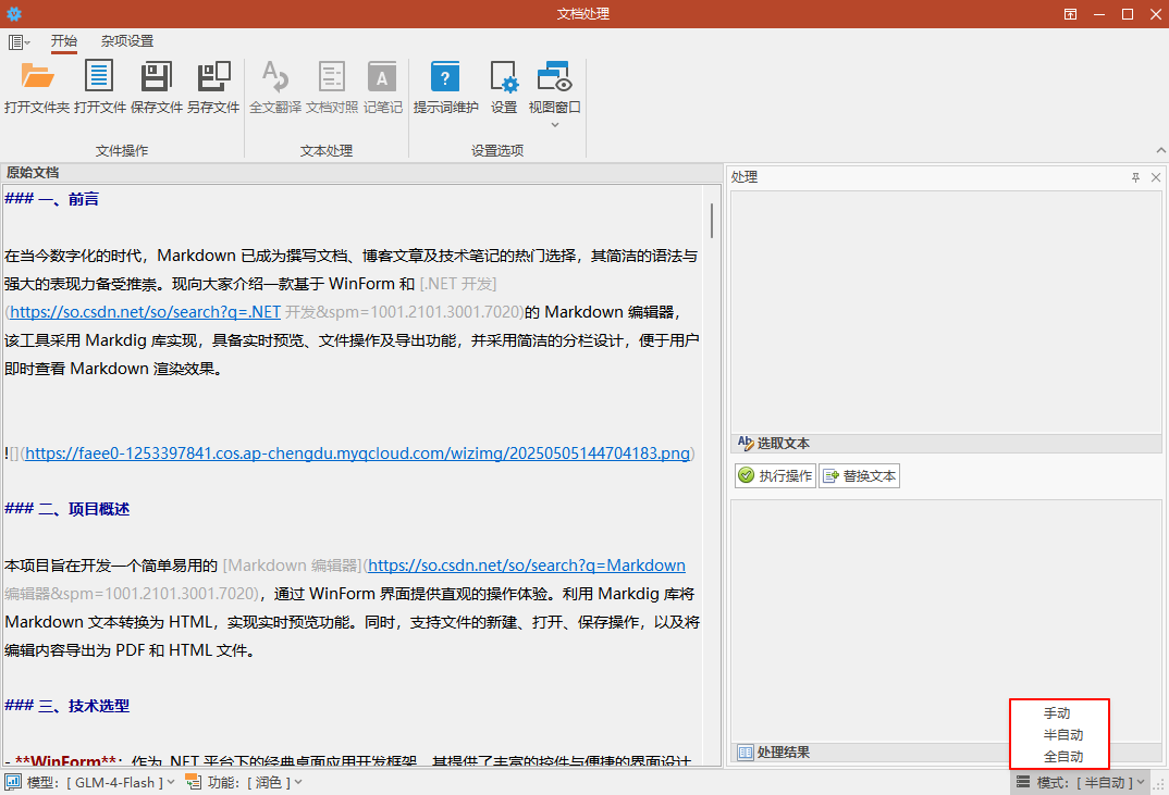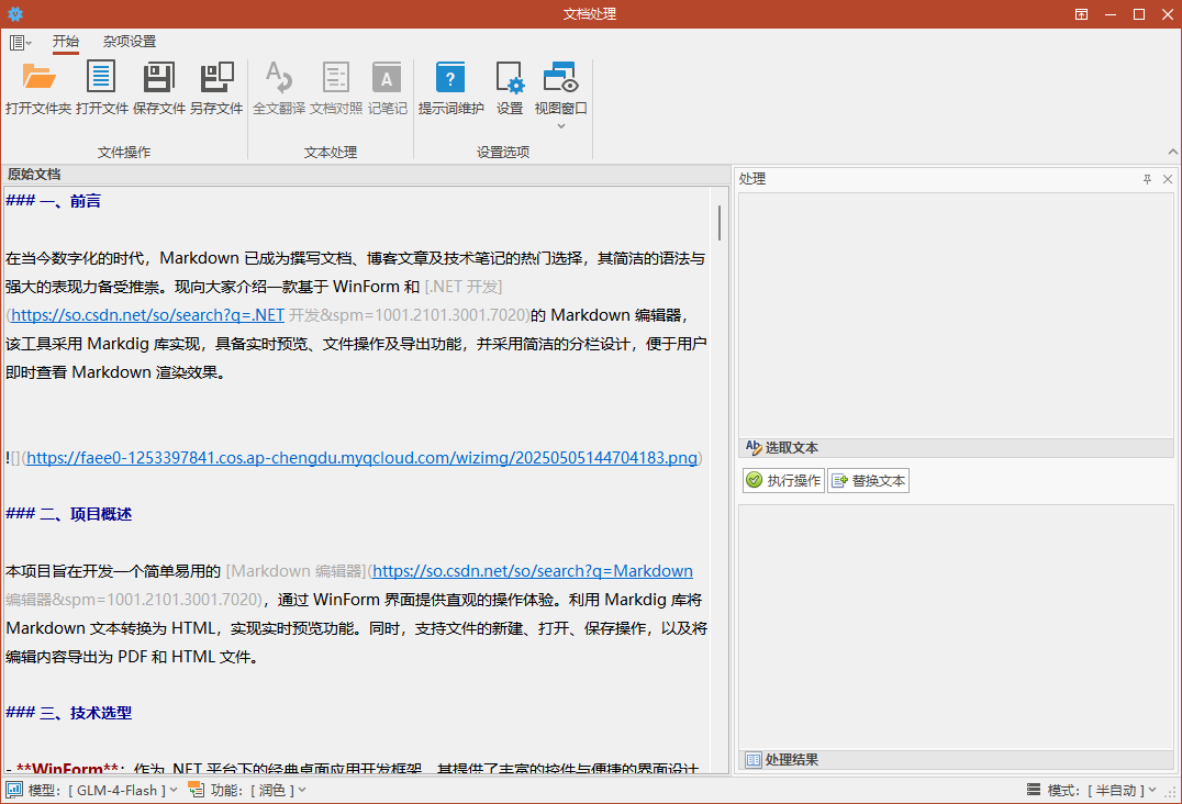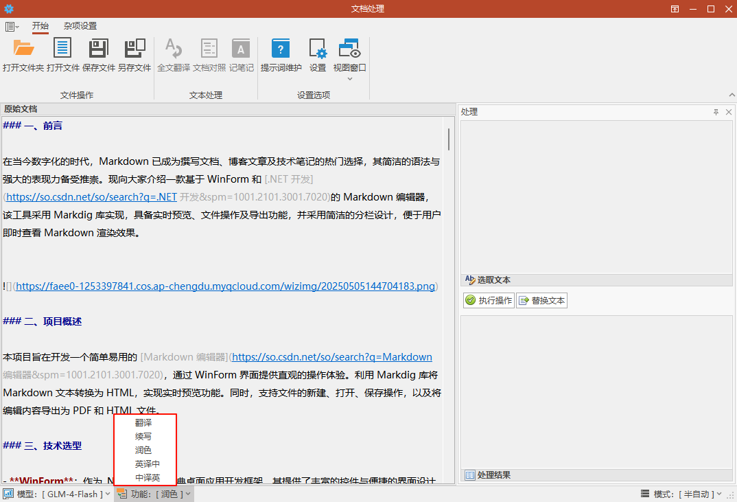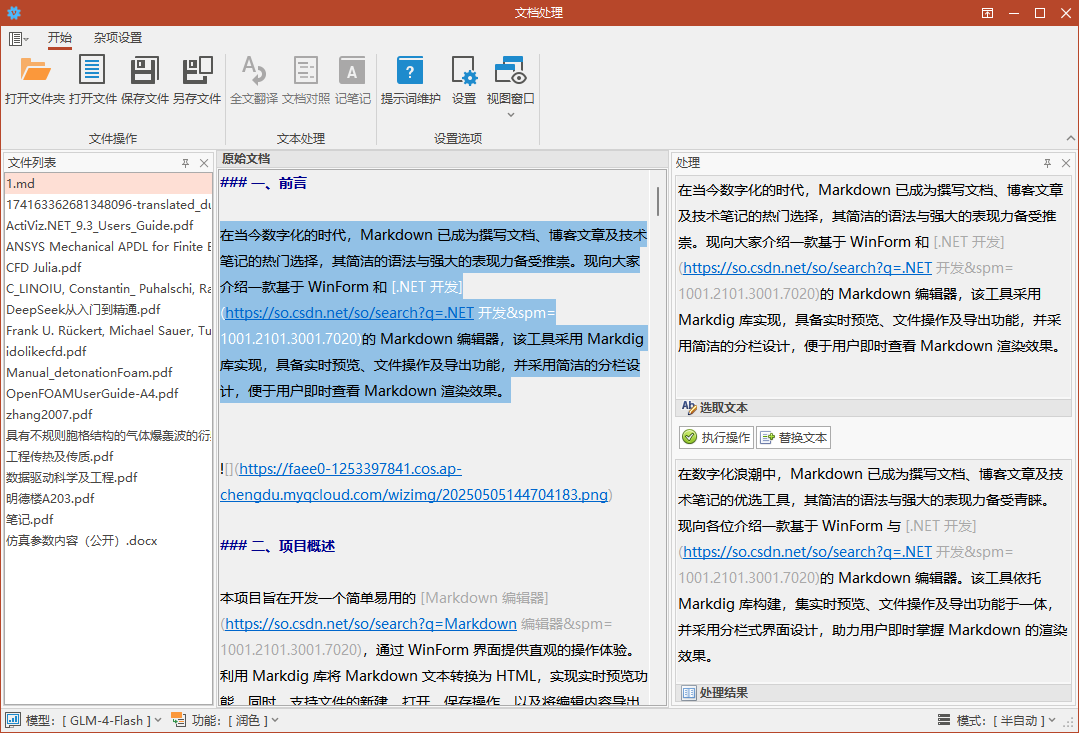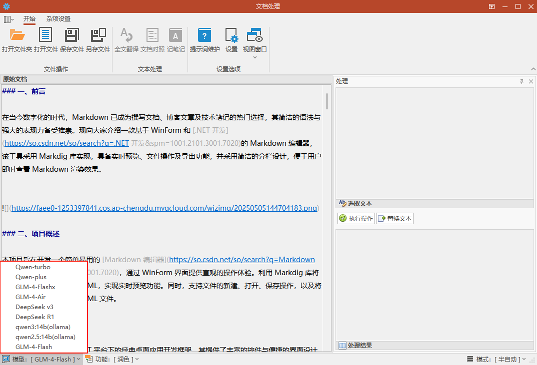 项目开始于2023年初,当时ChatGPT刚出来没多久,然后就想着利用AI大模型进行文档处理(翻译、润色等),不过当时ChatGPT实在是太烂,指令符合性太差,然后就放弃了,项目文件就一直在硬盘的角落里吃灰。