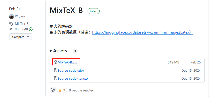 若想要直接使用,可以进入仓库的下载页面:https://github.com/RQLuo/MixTeX-Latex-OCR/releases。因为包含了AI模型在内,导致文件有点儿大,解压后即可使用。