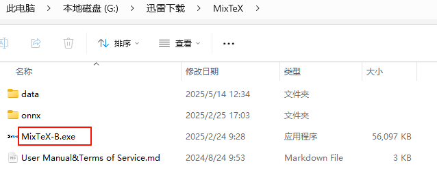 进入到解压后的目录下,双击 MixTex-B.exe 即可启动软件。启动的时候因为要加载大模型,所以时间可能有点儿长,大概需要十来秒钟。