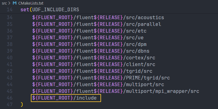 修改src文件夹下的CMakeLists.txt文件,第46行添加 ${FLUENT_ROOT}/include。不添加此行文本,在编译时会出现有大堆的找不到头文件的错误提示。