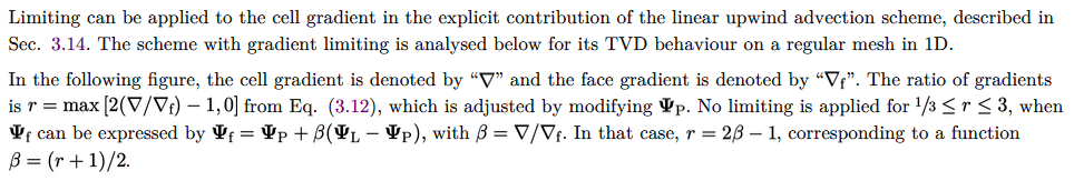 In the following figure, the cell gradient is denoted by "$nabla$" and the face gradient is denoted by "$nabla_{mathrm{f}}$". The ratio of gradients is $r = max left[2(nabla / nabla_{mathrm{f}}) - 1, 0right]$ from Eq. (3.12), which is adjusted by modifying $Psi_{mathrm{p}}$. No limiting is applied for $1/3 leq r leq 3$, when $Psi_{mathrm{f}}$ can be expressed by $Psi_{mathrm{f}} = Psi_{mathrm{p}} + beta left( Psi_{mathrm{L}} - Psi_{mathrm{p}} right)$, with $beta = nabla / nabla_{mathrm{f}}$. In that case, $r = 2beta - 1$, corresponding to a function $beta = (r + 1)/2$.