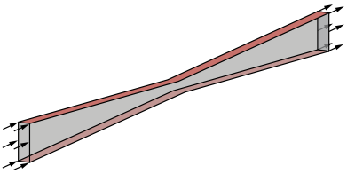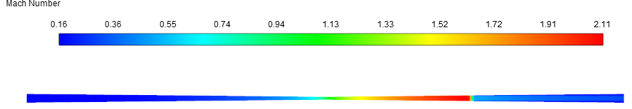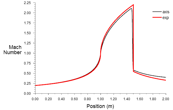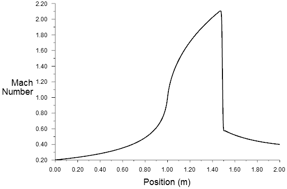 本案例计算如下图所示的收敛扩散管内正激波分布情况。最大马赫数为2.2,在管道的扩散段形成正激波。计算并与解析解对比管内马赫数分布。