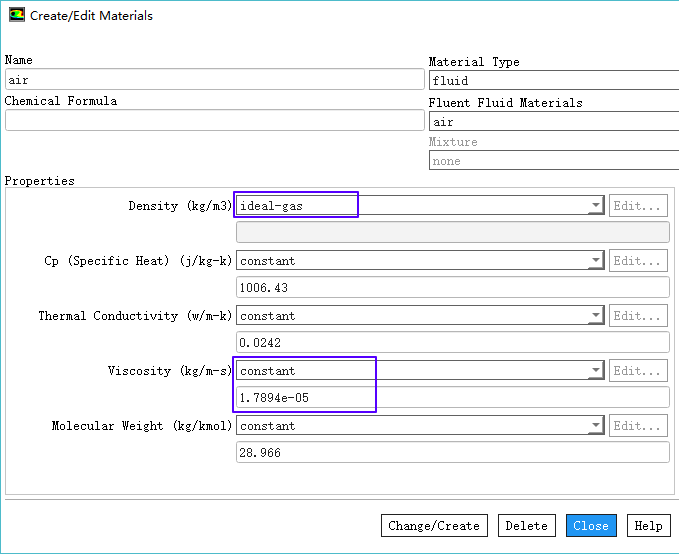 鼠标双击模型树节点Materials > Fluid > air弹出材料属性设置对话框