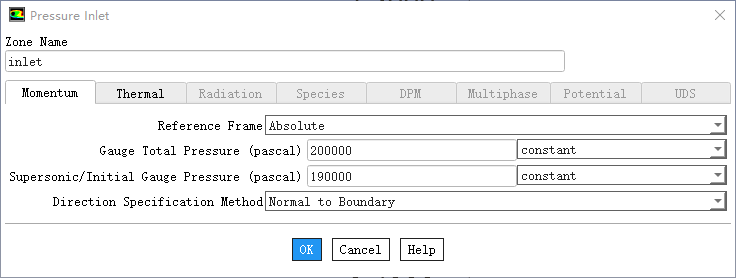 Momentum标签页设置Gauge Total Pressure为200000 Pa,Gauge Pressure为190000 Pa
