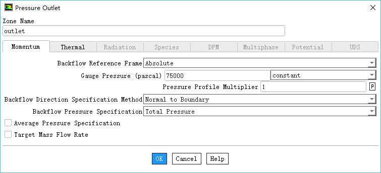Momentum标签页设置Gauge Pressure为75000 Pa