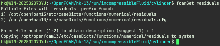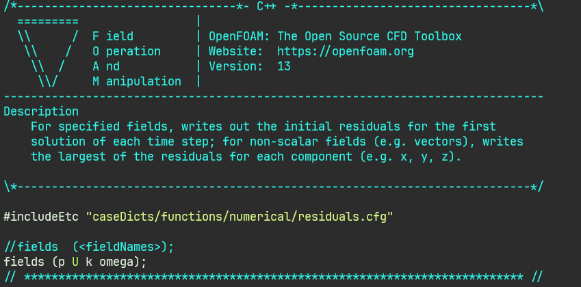 1. 准备 residuals文件。可以在案例文件路径中使用命令foamGet residuals将此文件拷贝到system文件夹下。