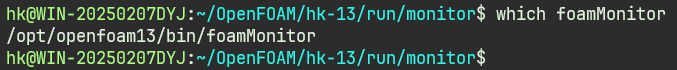 可以利用命令which foamMonitor找到系统中安装的foamMonitor,如下图所示,该脚本文件位于/opt/openfoam13/bin/foamMonitor。