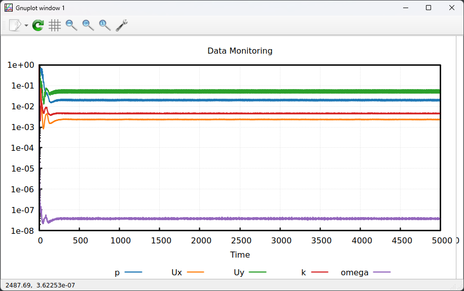 OpenFOAM可以使用foamMonitor程序进行图形绘制,其中用得最多的是用于残差监测。foamMonitor内部利用gnuplot来对数据文件进行图形绘制。不过默认的显示样式的确不敢恭维,如下图所示,图例和曲线叠到一起,而且x坐标太挤了。