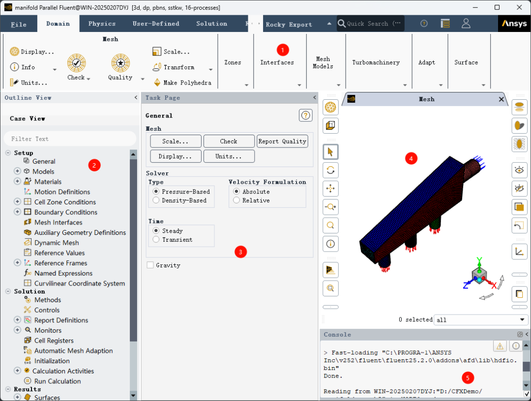 Fluent的界面在近几个版本改动比较大,最新版本界面如下图所示,其包括几个主要部分: