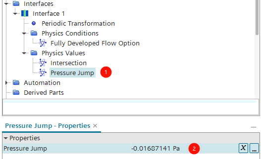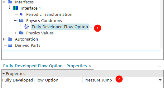 选择节点 Physics Conditions > Fully Developed Flow Option ,在属性窗口中指定 Fully Developed Flow Option为 Pressure Jump