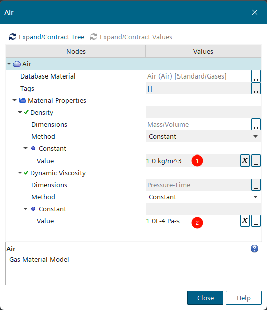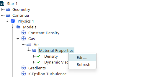 右键点击节点 Continua > Physics 1 > Models > Gas > Air > Material Properties ,选择 Edit… 打开参数编辑对话框