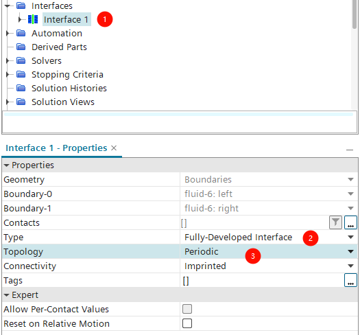 选择节点 Interfaces > Interface 1 ,在属性窗口中指定 Type为 Fully-Developed Interface ,指定Topology为 Periodic