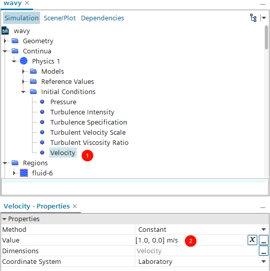 选择节点 Physics 1 > Initial Conditions > Velocity ,在属性窗口中指定参数 Value为[1.0, 0.0]m/s