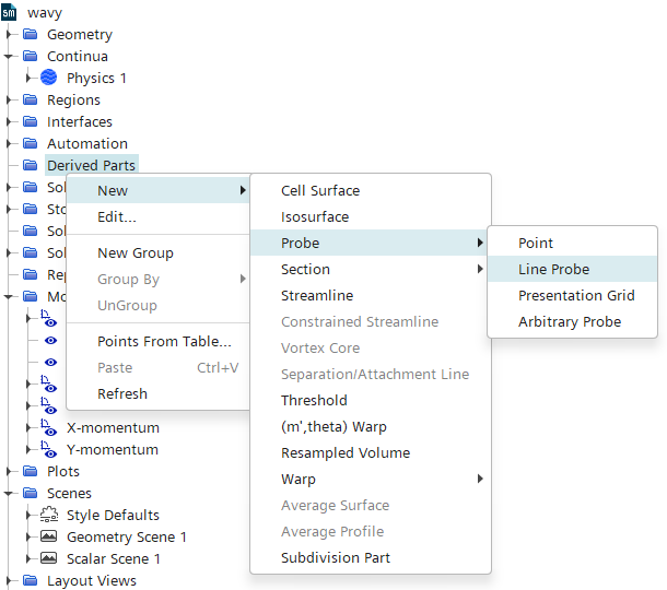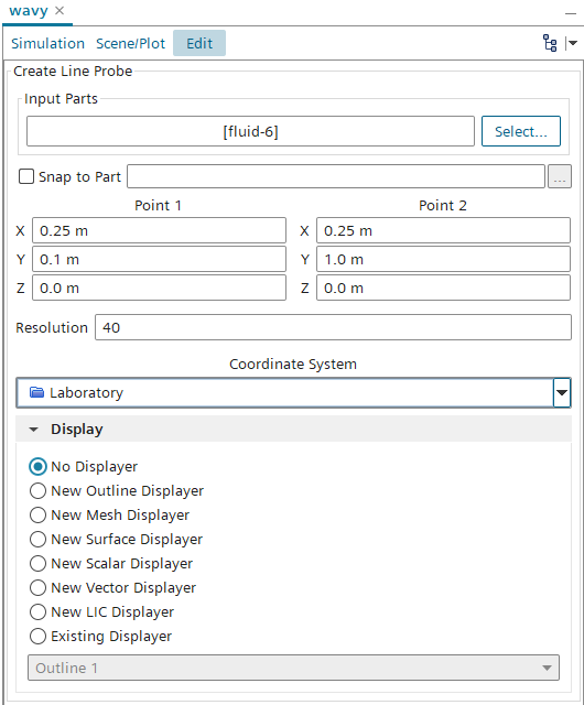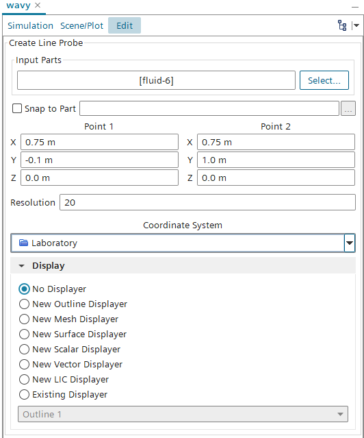 右键选择模型树节点 Derived Parts ,点击弹出菜单项 New > Probe > Line Probe 打开设置对话框