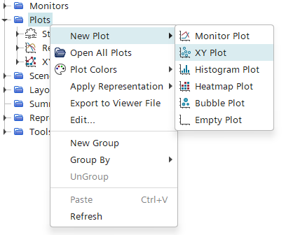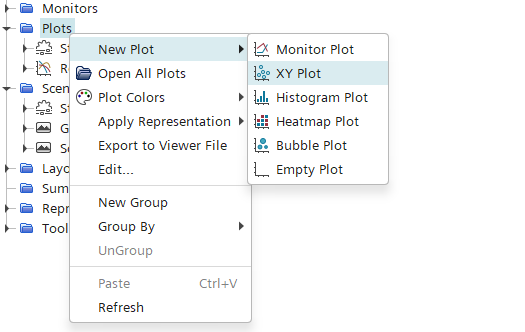 右键选择模型树节点 Plots ,点击弹出菜单项 New Plot > XY Plot