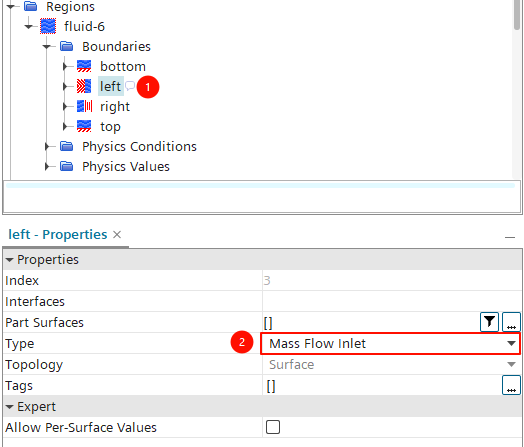 选中模型树节点 Regions > fluid-6 > Boundaries > left ,在属性窗口中指定 Type为 Mass Flow Inlet, 如下图所示